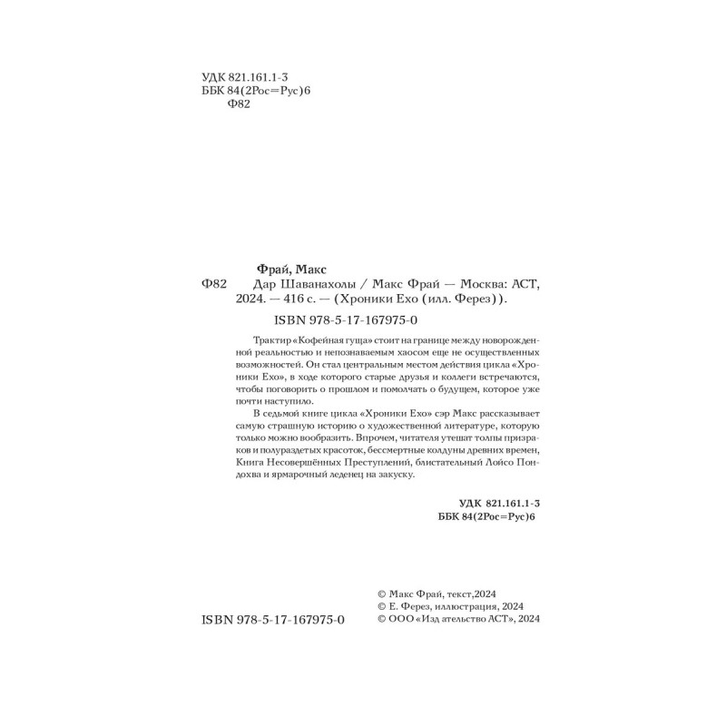 Трактир "Кофейная гуща" стоит на границе между новорожденной реальностью и непознаваемым хаосом еще не осуществленных возможностей. Он стал центральным местом действия цикла "Хроники Ехо", в ходе которого старые друзья и коллеги встречаются, чтобы поговорить о прошлом и помолчать о будущем, которое уже почти наступило. В седьмой книге цикла "Хроники Ехо" сэр Макс рассказывает самую страшную историю о художественной литературе, которую только можно вообразить. Впрочем, читателя утешат толпы призраков и полураздетых красоток, бессмертные колдуны древних времен, Книга Несовершённых Преступлений, блистательный Лойсо Пондохва и ярмарочный леденец на закуску.