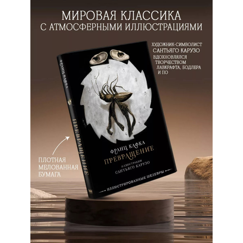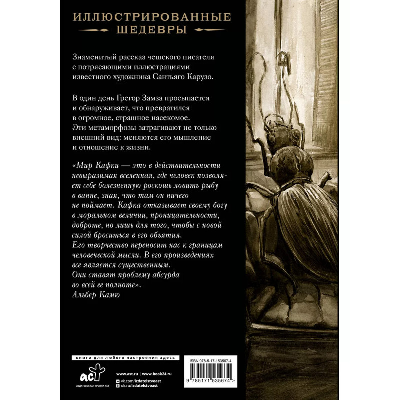 Превращение с иллюстрациями Сантьяго Карузо. - Знаменитая повесть Франца Кафки с иллюстрациями культового аргентинского художника Сантьяго Карузо. - Художник-символист Сантьяго Карузо вдохновляется творчеством Лавкрафта, Бодлера и По. Его работы полны темных красок, зияющих бездн, странных знаков и неведомых человечеству форм жизни. - Художнику удалось запечатлеть сюрреалистическую историю о бессмысленном и ужасающем превращении человека в насекомое. - Сюрреализм, одиночество, пустота в холодной комнате заточения и смерть как избавление от страданий в социуме - и всё это можно прочувствовать благодаря иллюстрациям Сантьяго Карузо. - Это превосходный подарок любому поклоннику великого Франца Кафки.