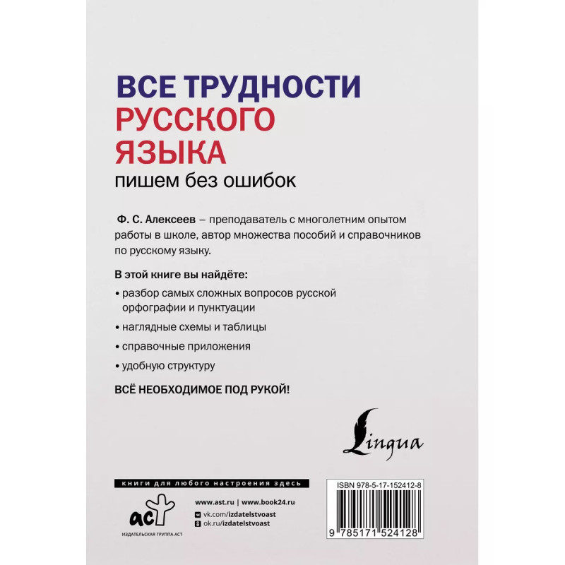 Все трудности русского языка. Пишем без ошибок. Ф. С. Алексеев - преподаватель с многолетним опытом работы в школе, автор множества пособий и справочников по русскому языку. В данном издании вы найдете ответы на самые распространенные вопросы орфографии и пунктуации. Структура книги позволяет легко найти интересующее правило благодаря сортировке по темам. Наглядное представление материала поможет эффективно усвоить информацию. Справочник пригодится всем, кто изучает русский язык, готовится к экзаменам или хочет освежить свои знания.
