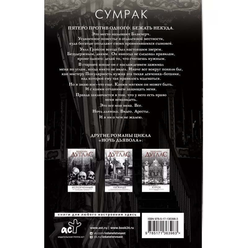 Сумрак. - От автора бестселлеров New York Times, USA Today и Wall Street Journal. - Пенелопа Дуглас - королева тёмного New Adult романа. - Пятая и заключительная часть цикла "Ночь дьявола"! - Герои цикла "Ночь дьявола" - морально серые личности с внутренними демонами и призраками прошлого. В "Сумраке" в центре сюжета история Уилла и Эмери. - Захватывающая тёмная сага получит долгожданную развязку и достойный финал. Блэкчерч - это тёмное элитное место, тюрьма-пансионат для тех, кому требуется искупление и время. Богатые родители отправляют туда своих сыновей. Уилл - один из "приговорённых". Но заточение не то, что пойдёт парню на пользу в том виде, в каком надеется его влиятельный дедушка. Уилл готовит план, и его цель - отомстить Эмери, которая виновна в его заточении. Но, может быть, Уилл просто хочет поблагодарить её. Ведь Блэкчерч сделал его только сильнее, расчётливее и опаснее.