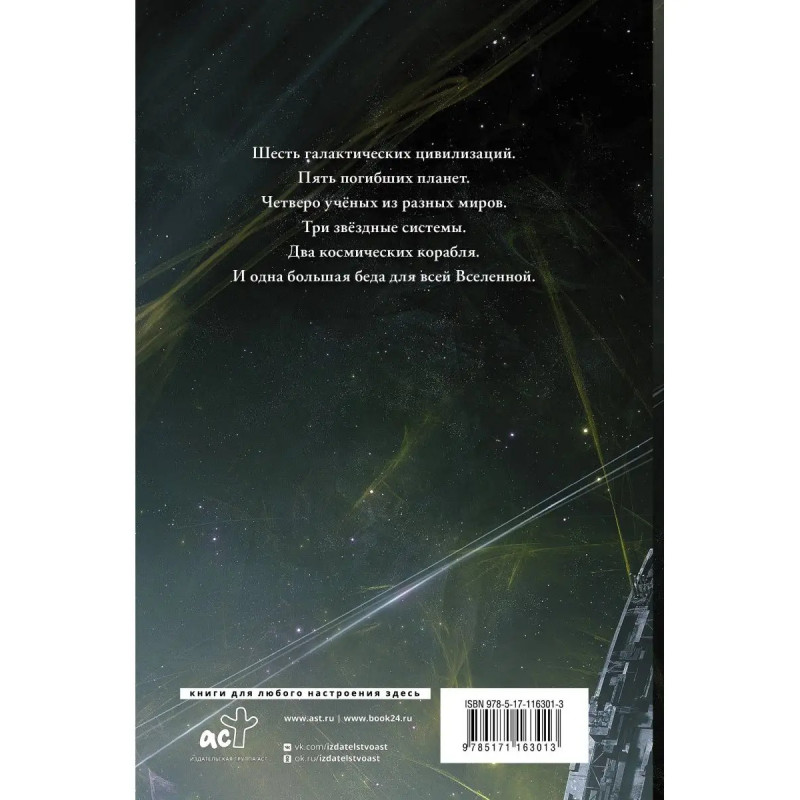 Шесть галактических цивилизаций. Пять погибших планет. Четверо учёных из разных миров. Три звёздные системы. Два космических корабля. И одна большая беда для всей Вселенной.