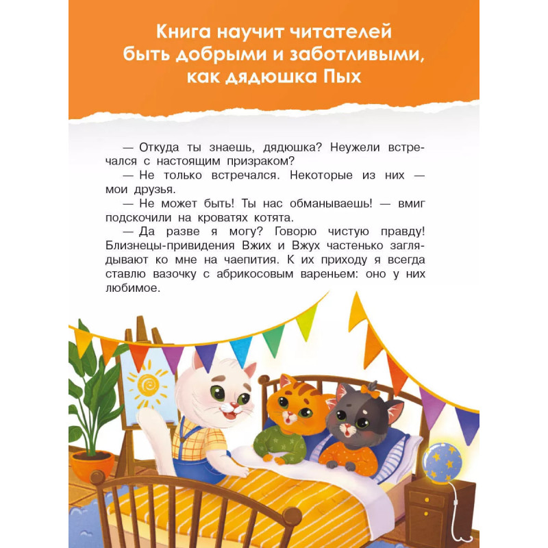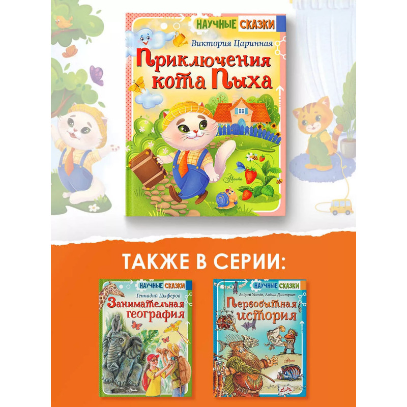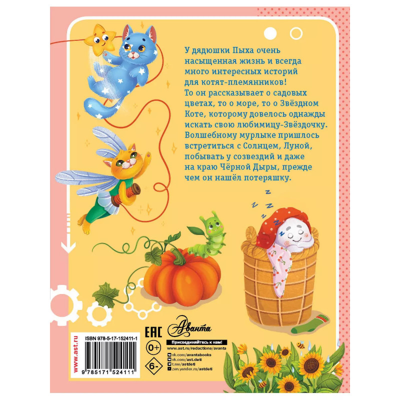 Приключения кота Пыха. У дядюшки Пыха очень насыщенная жизнь и всегда много интересных историй для котят-племянников! То он рассказывает о садовых растениях, то о море, то о Звёздном Коте, которому довелось однажды искать свою любимицу-Звёздочку Волшебному мурлыке пришлось встретиться с Солнцем, Луной, побывать у созвездий и даже на краю Чёрной Дыры, прежде чем он нашёл потеряшку. Весёлая и познавательная книга Виктории Царинной "Приключения кота Пыха" научит читателей быть добрыми и заботливыми, как дядюшка Пых, дружными и щедрыми, как перевоспитавшаяся корова Кабаму, и расскажет о том, как чуть не потерялась в одной из галактик расшалившаяся Звёздочка. Для младшего школьного возраста.