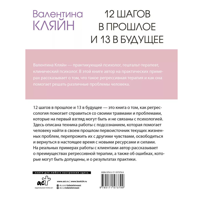 12 шагов в прошлое и 13 в будущее. Перепрограммирование судьбы через прошлые воплощения. 12 шагов в прошлое и 13 в будущее - это книга о том, как регрессология помогает справиться со своими травмами и проблемами, которые на первый взгляд могут быть и не связаны с психологией. Здесь описана техника работы с подсознанием, которая помогает человеку найти в своем прошлом первоисточник текущих жизненных проблем, перепрожить их с другими чувствами, освободиться и вернуться в настоящее время с новыми ресурсами и силами. На реальных примерах работы с клиентами автор рассказывает о преимуществах регрессивной терапии, а также об ошибках, которые могут быть допущены, и о результатах практики.