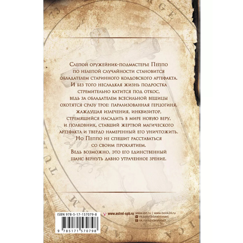 Фельдмаршал в бубенцах. Слепой оружейник-подмастерье Пеппо по нелепой случайности становится обладателем старинного колдовского артефакта. И без того несладкая жизнь подростка стремительно катится под откос, ведь за обладателем всесильной вещицы охотятся сразу трое: парализованная герцогиня, жаждущая излечения, инквизитор, стремящийся насадить в мире новую веру, и полковник, ставший жертвой магического артефакта и твердо намеренный его уничтожить. Но Пеппо не спешит расставаться со своим проклятием. Ведь, возможно, это его единственный шанс вернуть давно утраченное зрение.