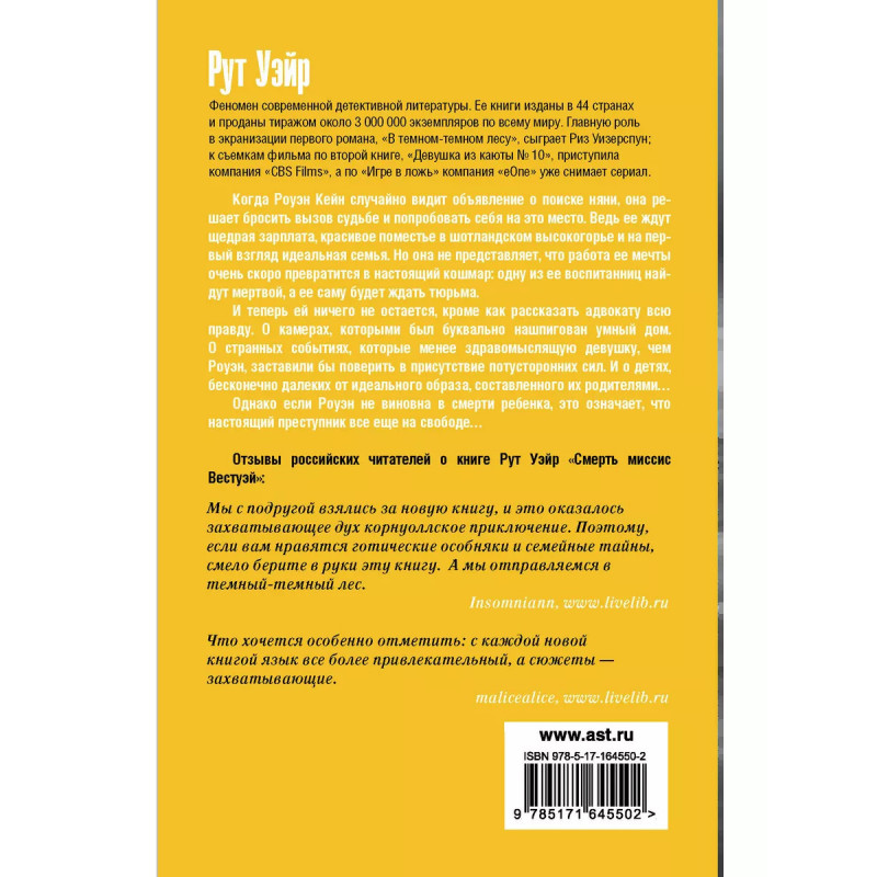 Когда Роуэн Кейн случайно видит объявление о поиске няни, она решает бросить вызов судьбе и попробовать себя на это место. Ведь ее ждут щедрая зарплата, красивое поместье в шотландском высокогорье и на первый взгляд идеальная семья. Но она не представляет, что работа ее мечты очень скоро превратится в настоящий кошмар: одну из ее воспитанниц найдут мертвой, а ее саму будет ждать тюрьма. И теперь ей ничего не остается, кроме как рассказать адвокату всю правду. О камерах, которыми был буквально нашпигован умный дом. О странных событиях, которые менее здравомыслящую девушку, чем Роуэн, заставили бы поверить в присутствие потусторонних сил. И о детях, бесконечно далеких от идеального образа, составленного их родителями Однако если Роуэн невиновна в смерти ребенка, это означает, что настоящий преступник все еще на свободе