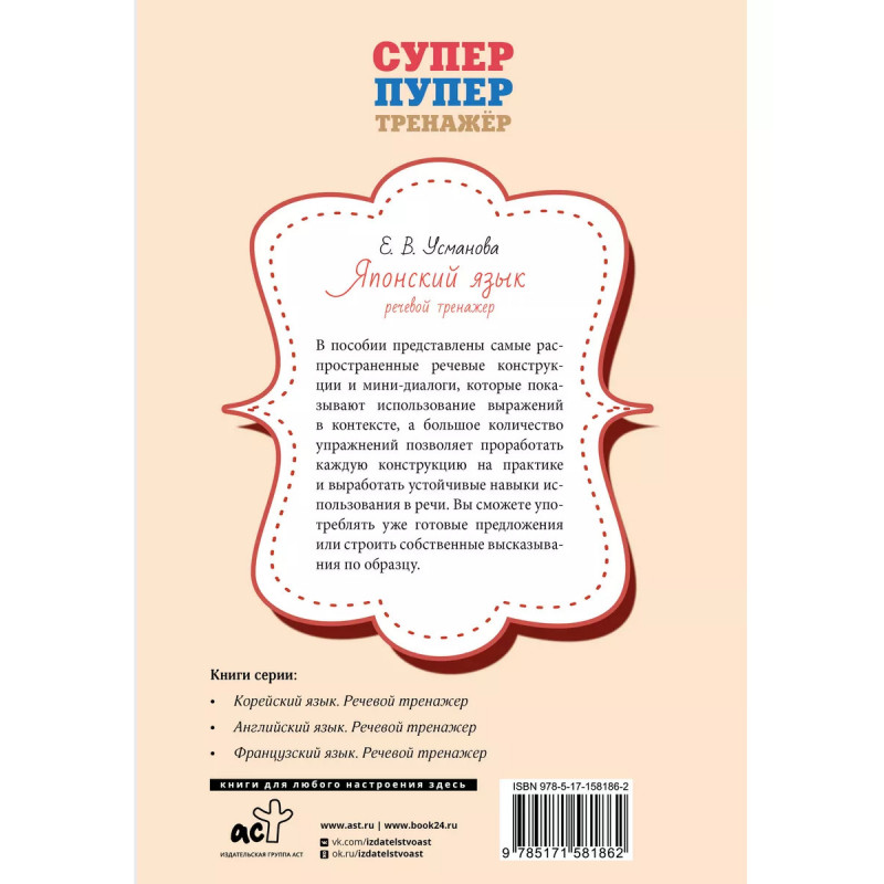 Японский язык. Речевой тренажер. Елена Усманова - дипломированный специалист по японскому языку и литературе, автор множества справочных и учебных пособий. В данном пособии представлены самые распространенные японские речевые конструкции и мини-диалоги, которые показывают использование выражений в контексте; большое количество упражнений позволяет проработать каждую конструкцию на практике и выработать устойчивые навыки использования в речи. Данное издание подходит для всех, кто учит японский язык.
