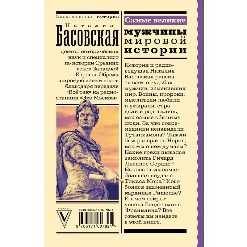 Самые великие мужчины мировой истории. Историк и радиоведущая Наталия Басовская рассказывает о судьбах мужчин, изменивших мир. Воины, пророки, мыслители любили и умирали, страдали и радовались как самые обычные люди. За что современники ненавидели Тутанхамона? Так ли был развратен Нерон, как мы о нем думаем? Какие грехи пытался замолить Ричард Львиное сердце? Какова была самая большая неудача Томаса Мора? Кого боялся знаменитый кардинал Ришелье? И в чем секрет успеха Бенджамина Франклина? Все ответы вы найдете в этой книге.