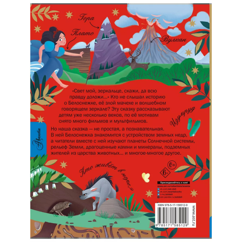 Белоснежка и тайны Земли. "Свет мой, зеркальце, скажи, да всю правду доложи " Кто не слышал историю о Белоснежке, её злой мачехе и волшебном говорящем зеркале? Эту сказку рассказывают детям уже несколько веков, по её мотивам снято много фильмов и мультфильмов. Но наша сказка - не простая, а познавательная. В ней Белоснежка знакомится с устройством земных недр, а читатели вместе с ней изучают планеты Солнечной системы, рельеф Земли, драгоценные камни и минералы, подземных жителей из царства животных... и многое-многое другое. Книгу украшают чудесные иллюстрации Светланы Зориной. Для младшего школьного возраста.