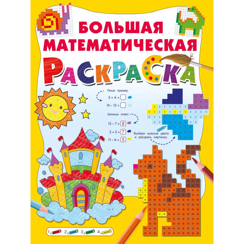 Большая математическая раскраска. "Большая математическая раскраска" - это сборник арифметических примеров для учеников начальной школы и замечательная книжка-раскраска. Решая примеры и раскрашивая клеточки по числам-ответам, ребёнок сможет развить математические навыки, проявит творческие способности, потренирует мелкую моторику.