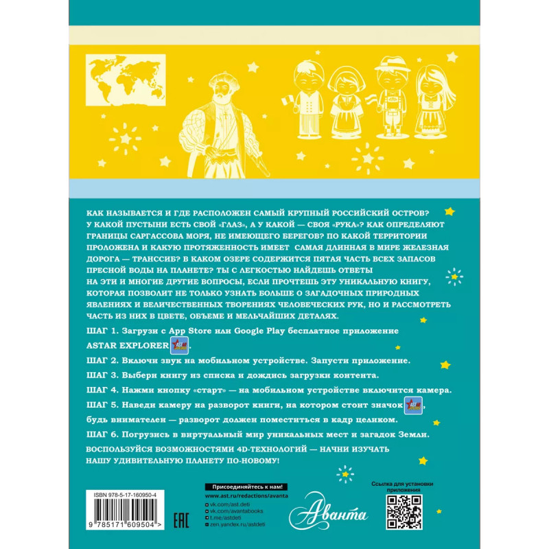Большой атлас мира для мальчиков с дополненной реальностью. Ты хочешь знать, чем прославился Виллем Баренц, а чем - Иван Папанин? Как назывался первый в мире пилотируемый космический аппарат и кто из космонавтов первым в истории Земли совершил полет на таком аппарате? На дне какой пещеры течет река Эхо? Откуда возникает торнадо и как образуется цунами? Для чего строят плотины? Кого и где охраняла знаменитая терракотовая армия? Почему птицу тукана называют амазонским клоуном? В какой части планеты можно наблюдать до 28 молний в минуту? На страницах этого уникального атласа с наглядными картами и зрелищными иллюстрациями ты отыщешь массу полезной информации о морях и океанах, странах и континентах, народах мира и их самобытных традициях, удивительных растениях и животных, редких атмосферных явлениях и чудесах природы, исторических и культурных достопримечательностях разных уголков земного шара. Ты сможешь получить ответы на свои самые каверзные вопросы, а дополненная реальность в виде 40-анимаций, снабженных информативными звукозаписями, сделает твое кругосветное путеше