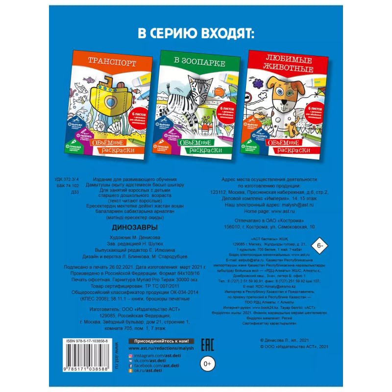 Динозавры. Раскраска и 3D-моделирование под одной обложкой? Запросто! Эта раскраска необычная: в ней есть не только картинки с красочным фоном, но и дополнительные элементы на отдельных листах, которые тоже нужно раскрасить, вырезать и наклеить по схеме на основную картинку. Теперь так легко сделать собственными руками объемные рисунки динозавров, а заодно дать волю фантазии, развить творческие способности и сообразительность! Открывай! Фантазируй! Твори!