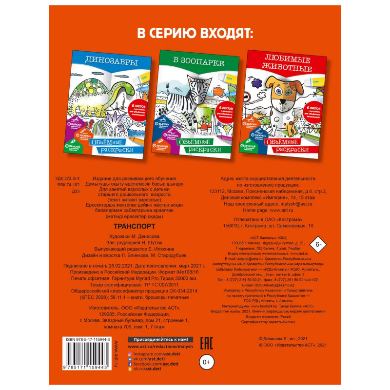 Транспорт. Раскраска и 3D-моделирование под одной обложкой? Запросто! Эта раскраска необычная: в ней есть не только картинки с красочным фоном, но и дополнительные элементы на отдельных листах, которые тоже нужно раскрасить, вырезать и наклеить по схеме на основную картинку. Теперь так легко сделать собственными руками объемные рисунки машин, а заодно дать волю фантазии, развить творческие способности и сообразительность! Открывай! Фантазируй! Твори!