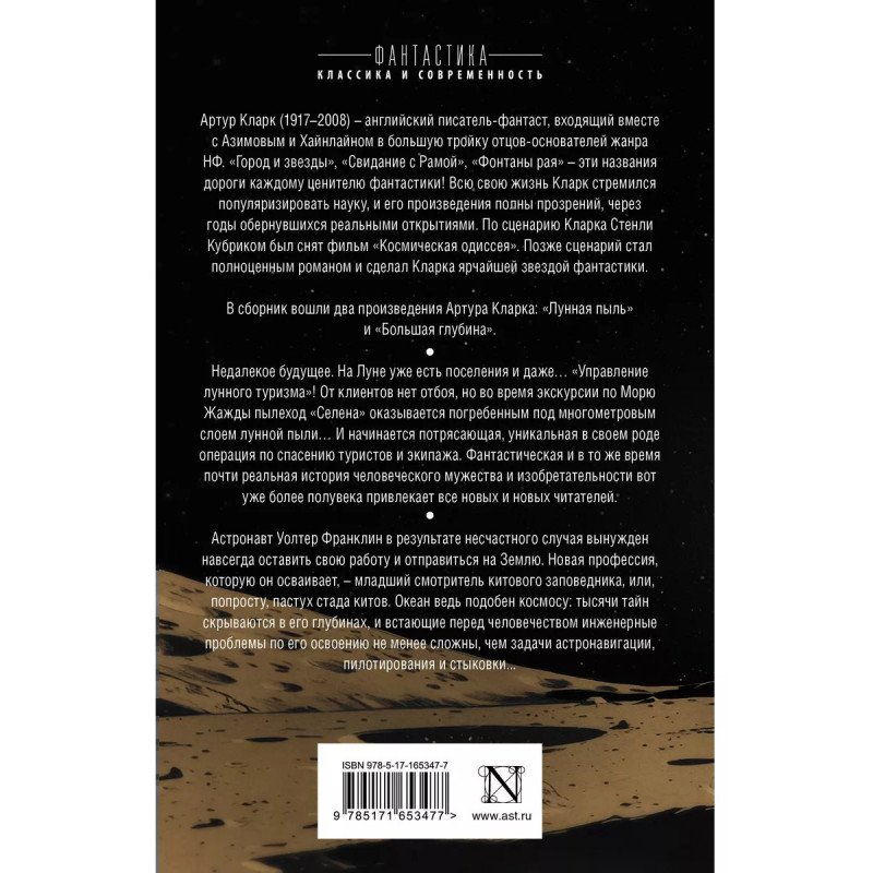 "Лунная пыль". Недалекое будущее. На Луне уже есть поселения и даже "Управление лунного туризма"! От клиентов нет отбоя, но во время экскурсии по Морю Жажды пылеход "Селена" оказывается погребенным под многометровым слоем лунной пылиИ начинается потрясающая, уникальная в своем роде операция по спасению туристов и экипажа. Фантастическая и в то же время почти реальная история человеческого мужества и изобретательности вот уже более полувека привлекает все новых и новых читателей. "Большая глубина". Астронавт Уолтер Франклин в результате несчастного случая вынужден навсегда оставить свою работу и отправиться на Землю. Новая профессия, которую он осваивает младший смотритель китового заповедника, или, попросту, пастух стада китов. Океан ведь подобен космосу: тысячи тайн скрываются в его глубинах, и встающие перед человечеством инженерные проблемы по его освоению не менее сложны, чем задачи астронавигации, пилотирования и стыковки...