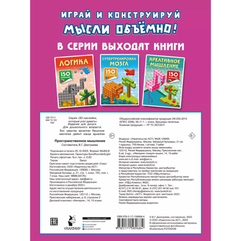 Пространственное мышление. "Пространственное мышление" - это развивающая книжка с 3D-наклейками для детей от 5 лет. 3D-стикеры - специальные "кирпичики", из которых нужно строить различные трёхмерные объекты. Заниматься по рабочей тетради не только интересно, но и очень полезно, ведь моделирование объёмных предметов стимулирует пространственное мышление, а игра с наклейками способствует развитию мелкой моторики.