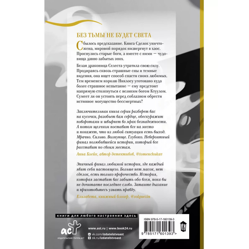 Сбылось предсказание. Книга Сделок уничтожена, мировой порядок низвергнут в хаос. Проснулись старые боги, а вместе с ними - чудовища давно забытых эпох. Белая драконица Селеста утратила свою силу. Продираясь сквозь страшные сны и темные видения, она ищет способ спасти своих любимых. Тем временем королю Никлосу уготовано куда более страшное испытание - ему престоит напрямую столкнуться с великим богом Ктуулом. Сумеет ли он устоять перед соблазном обрести истинное могущество бессметных?