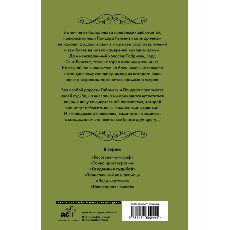 Сведенные судьбой. В отличие от большинства лондонских дебютанток, прекрасная леди Пандора Рейвенел категорически не находила удовольствия в вихре светских развлечений и тем более не имела намерений выходить замуж. Да и неисправимый холостяк Габриель, лорд Сент-Винсент, тоже не горел желанием жениться. Но случайное знакомство на балу невольно привело к грандиозному скандалу, выход из которого лишь один: они должны пожениться как можно скорее. Без особой радости Габриель и Пандора покоряются своей судьбе, но внезапно им приходится встретиться лицом к лицу со смертельной опасностью, которой они могут избежать лишь совместными усилиями. И "молодожены поневоле", сами того не замечая, с каждым днем становятся все ближе друг другу...