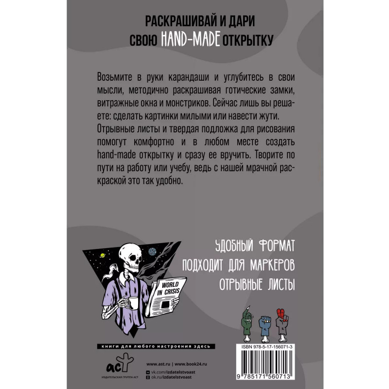 Современная готика. Открытка-раскраска. Возьмите в руки карандаши и углубитесь в свои мысли, методично раскрашивая готические замки, витражные окна и монстриков. Сейчас лишь вы решаете: сделать картинки милыми или навести жути. Отрывные листы и твердая подложка для рисования помогут комфортно и в любом месте создать hand-made открытку и сразу ее вручить. Творите по пути на работу или учебу, ведь с нашей мрачной раскраской это так удобно.
