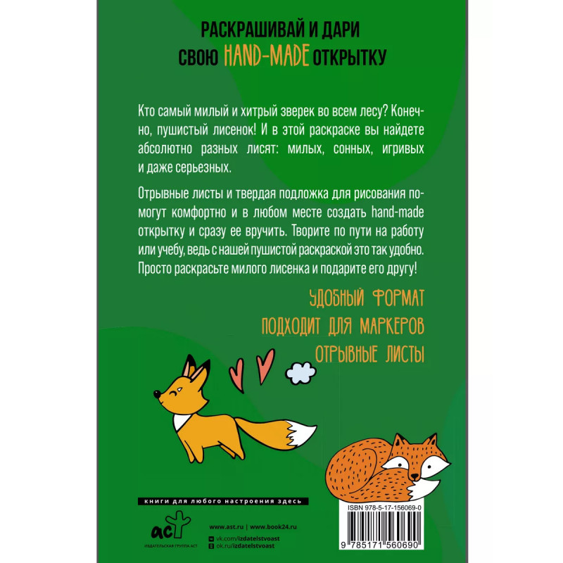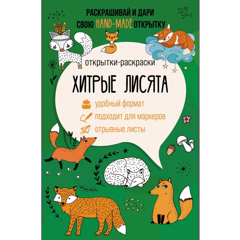 Хитрые лисята. Открытка-раскраска. Отрывные листы и твердая подложка для рисования - помогут комфортно и в любом месте создать hand-made открытку и сразу ее вручить. Просто раскрасьте милого лисенка и подарите его другу!