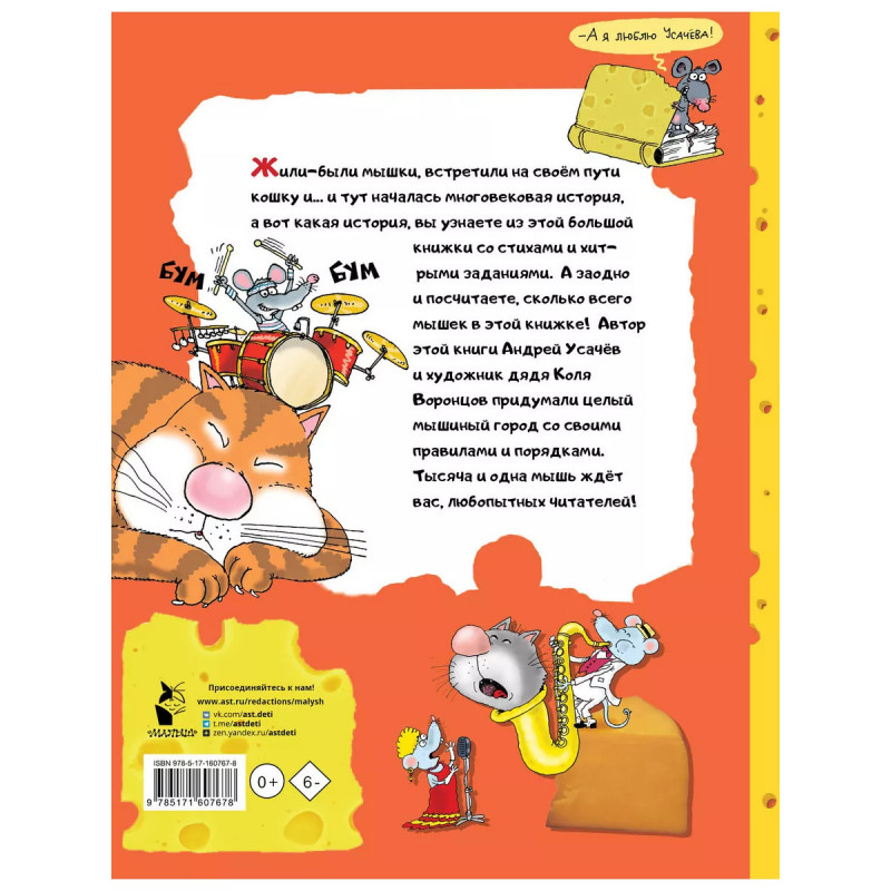 Тысяча и одна мышь. Жили-были мышки, встретили на своём пути кошку и... и тут началась многовековая история, а вот какая история, вы узнаете из этой большой книжки со стихами и хитрыми заданиями. А заодно и посчитаете, сколько всего мышек в этой книжке! Автор этой книги Андрей Усачёв и художник дядя Коля Воронцов придумали целый мышиный город со своими правилами и порядками. Тысяча и одна мышь ждёт вас, любопытных читателей!