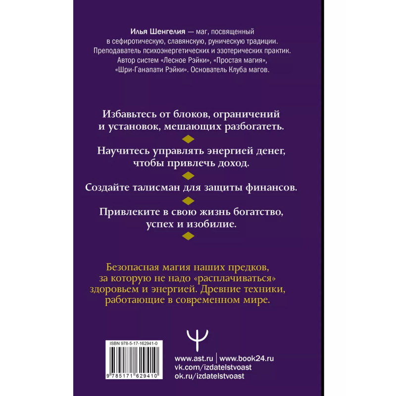 Илья Шенгелия маг, посвященный в сефиротическую, славянскую, руническую традиции. Автор систем "Лесное Рэйки", "Простая магия", "Шри-Ганапати Рэйки". Основатель Клуба магов. Привлеките изобилие, благосостояние и успех с помощью самых действенных техник, собранных в книге. Илья Шенгелия предлагает работающие методы и ритуалы, доказавшие свою эффективность уже на тысячах его учеников. Вы избавитесь от блоков, мешающих разбогатеть, научитесь управлять энергией денег. Победите страх нищеты и пропустите денежный поток через тело, используя уникальные авторские медитации. Выясните, как правильно ухаживать за наличными, чтобы деньги сами тянулись к вашему кошельку. Узнаете, как избегать ловушек, которые расставляет мозг, а также построите магический квадрат для привлечения богатства. Поймете, что такое протоязык, и познакомитесь с денежными формулами и заклинаниями на нем. Перестройте мироощущение, чтобы получать больше денег. Впустите в свою жизнь комфорт, уверенность в завтрашнем дне и материальное благополучие.