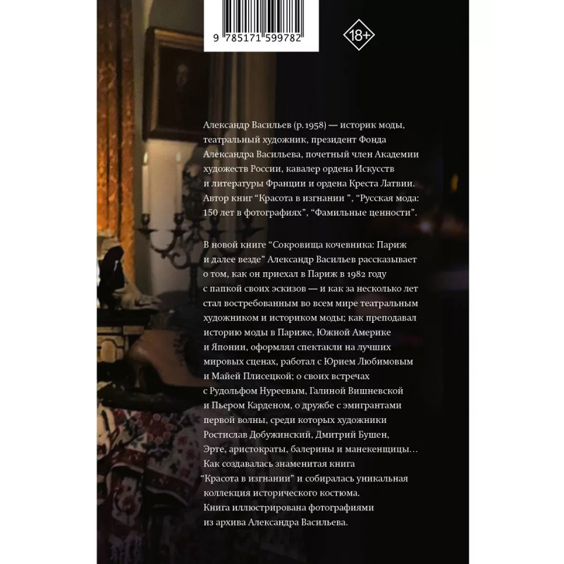 Сокровища кочевника: Париж и далее везде. Новая книга известного историка моды, театрального художника и телеведущего Александра Васильева. Продолжение серии "Мемуары - XXI век", в которой вышел бестселлер "Фамильные ценности". Уникальные фотографии из архива автора. Вдохновляющая история. В 1982 году юный Александр Васильев приехал из Москвы в Париж с папкой своих эскизов. Уже через несколько лет он стал известным художником, историком моды, коллекционером. Его путь - пример того, как любовь к своему делу способна покорить целый мир.