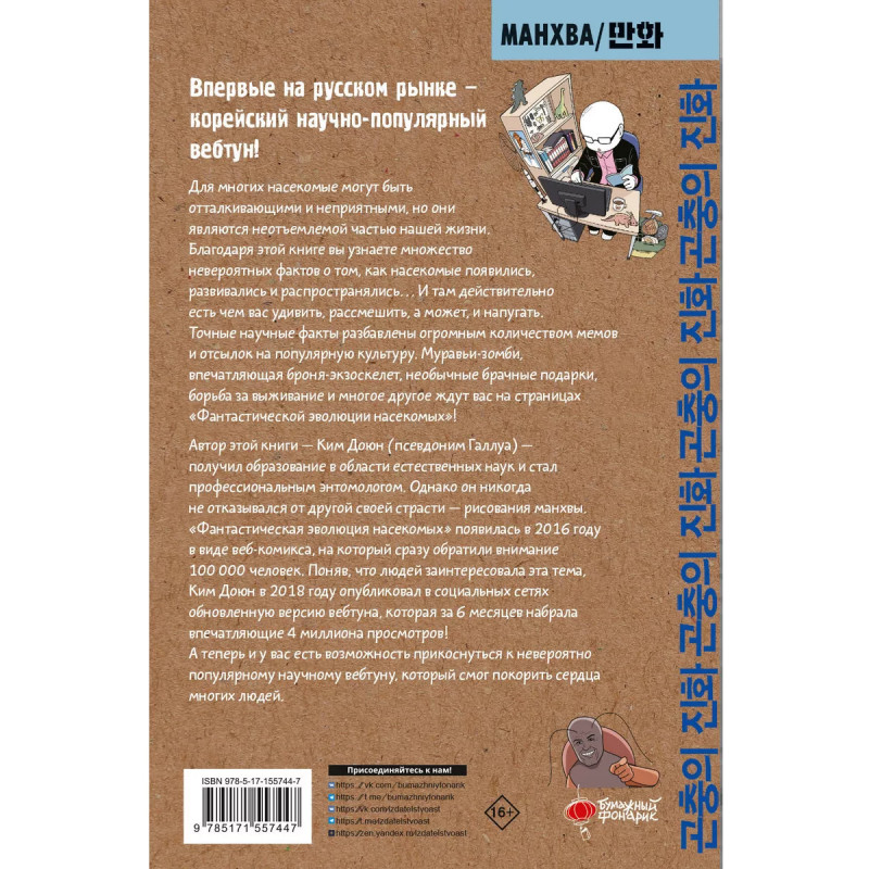 Фантастическая эволюция насекомых. "Фантастическая эволюция насекомых" - это научно-популярный корейский вебтун, который благодаря бешеной популярности в интернете (более 4 миллионов просмотров) позже был издан в печатном формате. Благодаря этой книге вы сможете узнать все о происхождении, развитии и жизни насекомых. Узнаете о теориях происхождения крыльев, экзоскелете, взаимодействии этих животных с растениями, а также о необычных привычках и опасностях, которые несут насекомые. Манхва написана и нарисована профессиональным энтомологом Ким Доюном, который изучает эволюцию насекомых в течение многих лет. На русском ее содержание было проверено кандидатом биологических наук и доцентом Ириной Песковой. Данная работа будет интересна всем, кто хочет получить профессиональные знания без напряжения и занудных текстов. Книга написана легким слогом и содержит наглядные рисунки, узнаваемые отсылки и множество смешных мемов! Для широкого круга читателей.