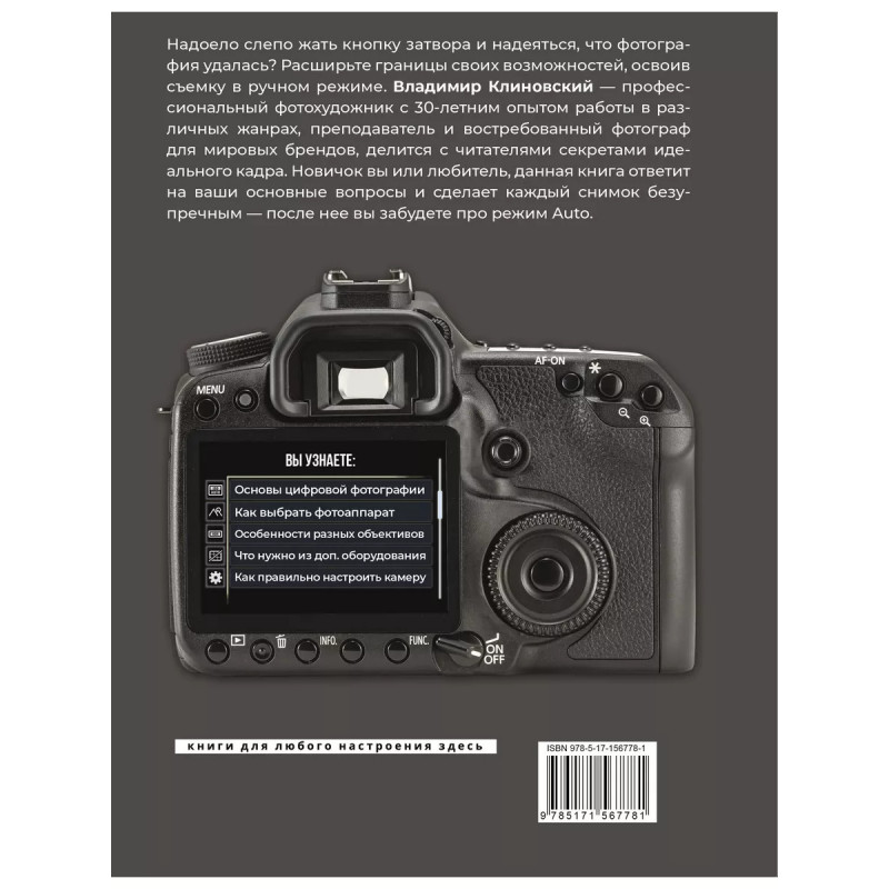 Фотография. Выключи режим Auto и делай отличные снимки. Надоело слепо жать кнопку затвора и надеяться, что фотография удалась? Расширьте границы своих возможностей, освоив съемку в ручном режиме. Владимир Клиновский - профессиональный фотохудожник с 30-летним опытом работы в различных жанрах, преподаватель и востребованный фотограф для мировых брендов, делится с читателями секретами идеального кадра. Новичок вы или любитель, данная книга ответит на ваши основные вопросы и сделает каждый снимок безупречным - после нее вы забудете про режим Auto.