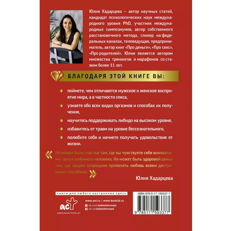 Про секс. Все об удовольствии и наслаждении. Как научиться получать удовольствие от секса и идти в него из позиции "хочу", а не из позиции "надо"? Как сохранить страсть надолго? Как поддерживать либидо на высоком уровне? Ответы на эти и другие вопросы раскрывает в своей книге "Про секс" Юлия Хадарцева - лидер в системе метода расстановок в России, мировой рекордсмен по расстановкам, кандидат психологических наук, эксперт федеральных каналов, а также автор тренингов и марафонов, которые прошли более 35 000 человек. Книга "Про секс" - это работа с телом, душой, установками и родовыми программами, которые не дают нам выйти в наслаждение. Благодаря этой книге вы поймете, чем отличаются мужское и женское восприятие мира, узнаете обо всех видах оргазмов и способах их получения, а также полюбите себя и секс. Вся серия книг Юлии построена на практическом подходе, поэтому мы также рекомендуем вам прочесть книги "Про родителей" и "Про деньги".