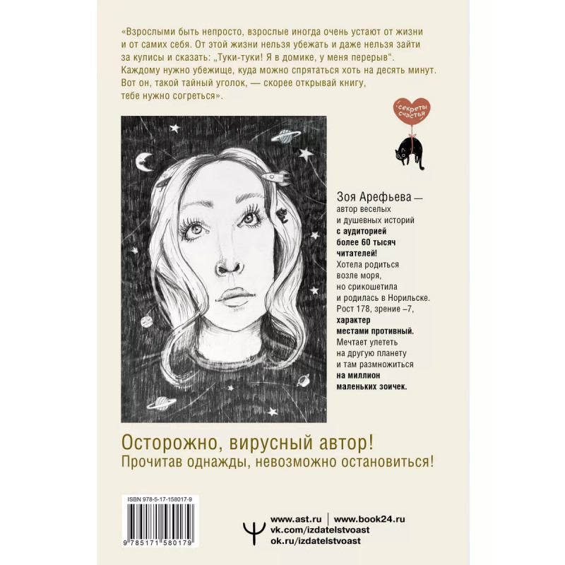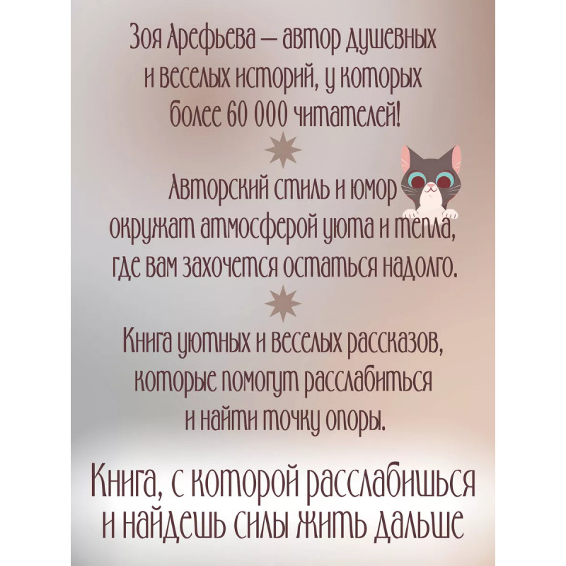 Обнимашки с мурозданием. Теплые сказки о счастье, душевном уюте и звездах, которые дарят надежду. Книга с "успокоительным" эффектом! Когда всё наскучило, замучило и надоело, на помощь придет сборник уютных терапевтических сказок Зои Арефьевой "Обнимашки с мурозданием"! С этой книгой любой загрустивший взрослый сможет отвлечься от повседневных забот и немного поразмышлять в компании проникновенных героев - о смысле жизни, о люби, о счастье, о вдохновении и прочих "важностях". А еще - найти для себя мудрую мысль и превратить ее в девиз каждого нового дня. Добрые и трогательные истории с щепоткой юмора, житейской философии и волшебства подскажут читателям верное решение и поднимут настроение при любой душевной непогоде.