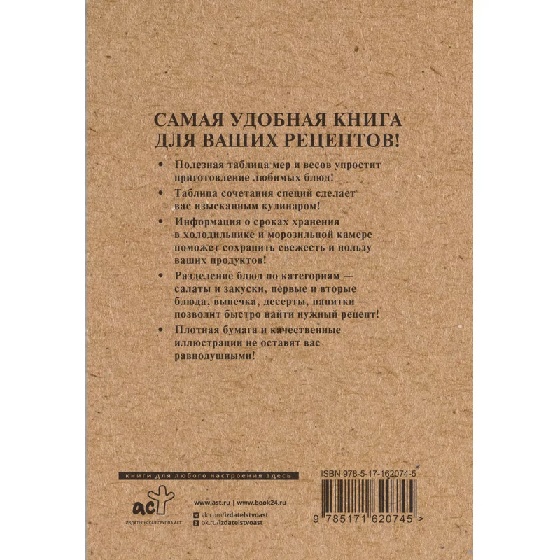 Книга для записи рецептов. САМАЯ УДОБНАЯ КНИГА ДЛЯ ВАШИХ РЕЦЕПТОВ! " Полезная таблица мер и весов упростит приготовление любимых блюд! " Таблица сочетания специй сделает вас изысканным кулинаром! " Информация о сроках хранения в холодильнике и морозильной камере поможет сохранить свежесть и пользу ваших продуктов! " Разделение блюд по категориям - салаты и закуски, первые и вторые блюда, выпечка, десерты, напитки - позволит быстро найти нужный рецепт! " Плотная бумага и качественные иллюстрации не оставят вас равнодушными!