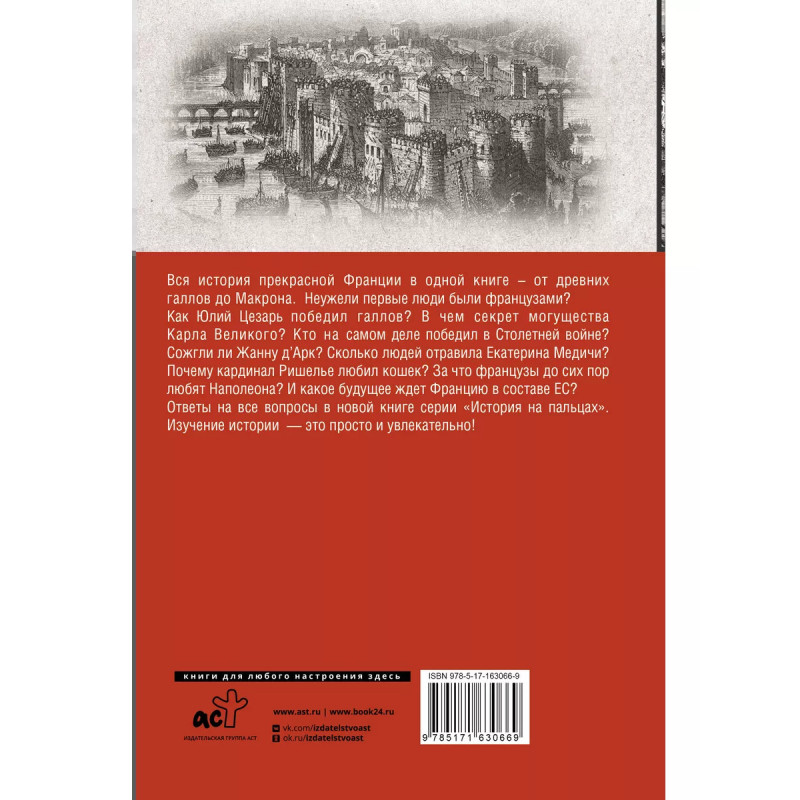 Вся история прекрасной Франции в одной книге от древних галлов до Макрона. Неужели первые люди были французами? Как Юлий Цезарь победил галлов? В чем секрет могущества Карла Великого? Кто на самом деле победил в Столетней войне? Сожгли ли Жанну дАрк? Сколько людей отравила Екатерина Медичи? Почему кардинал Ришелье любил кошек? За что французы до сих пор любят Наполеона? И какое будущее ждет Францию в составе ЕС? Ответ на все вопросы в новой книге серии "История на пальцах". Изучение истории это просто и увлекательно!