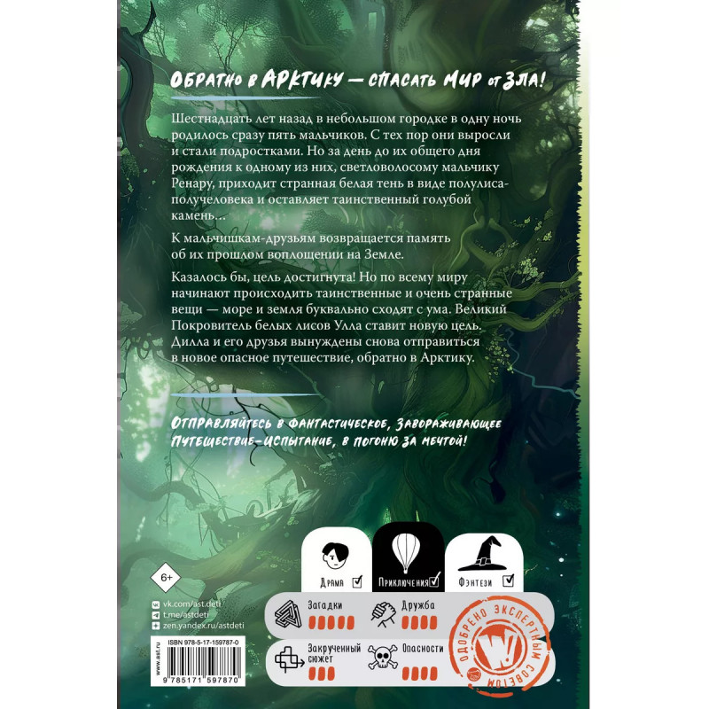 Шестнадцать лет назад в небольшом городке в одну ночь родились сразу пять мальчиков. С тех пор они выросли и стали подростками. Но за день до их общего дня рождения к одному из них, светловолосому мальчику Ренару, приходит странная белая тень в виде полулиса-получеловека и оставляет таинственный голубой камень К мальчишкам-друзьям возвращается память об их прошлом воплощении на Земле. Казалось бы, цель достигнута! Но по всему миру начинают происходить таинственные и очень странные вещи море и земля буквально сходят с ума. Великий Покровитель белых лисов Улла ставит новую цель. Дилла и его друзья вынуждены снова отправиться в новое опасное путешествие, обратно в Арктику.