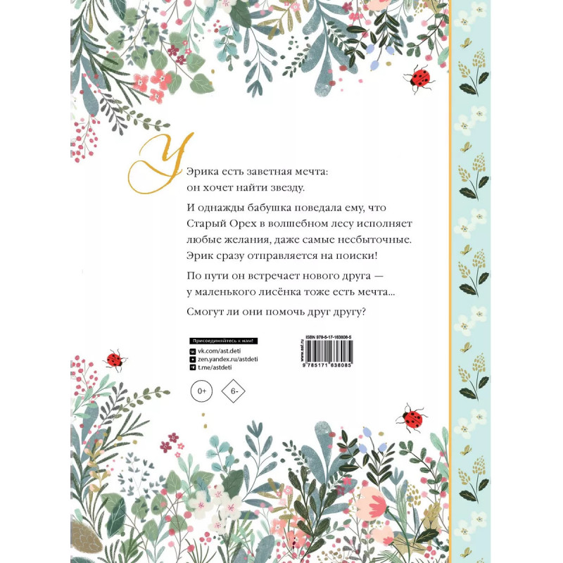 Наверняка ты любишь мечтать. У Эрика тоже есть заветная мечта: он хочет найти звезду. Похоже, осуществить её невозможно. Но однажды бабушка поведала ему, что Старый Орех в волшебном лесу исполняет любые желания, даже самые несбыточные. Эрик сразу отправляется на поиски! И, кажется, у него даже появится новый необычный друг у маленького лисёнка тоже есть одна заветная мечта... Смогут ли они помочь друг другу?