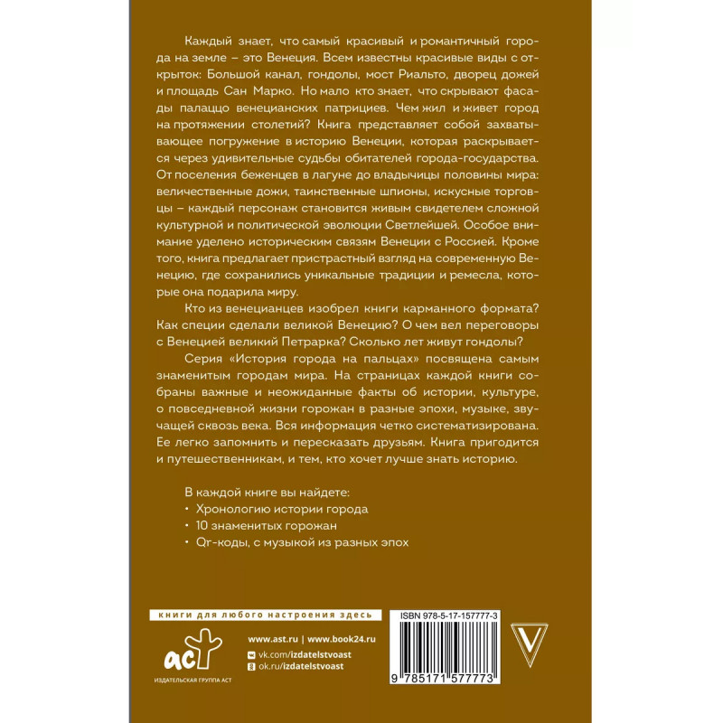 Serenissima, или "безмятежная", "жемчужина Адриатики", самый романтичный уголок Европы все это о прекрасной Венеции, которая, как гласит легенда, возникла из морской пены в 421 году. Величественная архитектура, неповторимая атмосфера свободы и легкости, оживленные лабиринты улиц ансамбль, который обязательно нужно увидеть, услышать и ощутить. Вместо дорог здесь каналы, а вместо автомобилей лодки и катера. "На воде нет пятен" говорит местная пословица. Венеция настолько совершенна, что на ней нет пятен Серия "История города на пальцах" посвящена самым знаменитым городам мира. На страницах каждой книги собраны самые важные и неожиданные факты об истории, культуре, о повседневной жизни горожан в разные эпохи, о музыке, звучащей сквозь века. Вся информация четко систематизирована. Забавные и интересные факты легко запомнить и пересказать друзьям. Книга пригодится и путешественникам, и тем, кто хочет лучше знать свою историю.