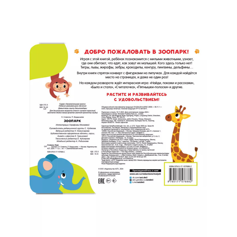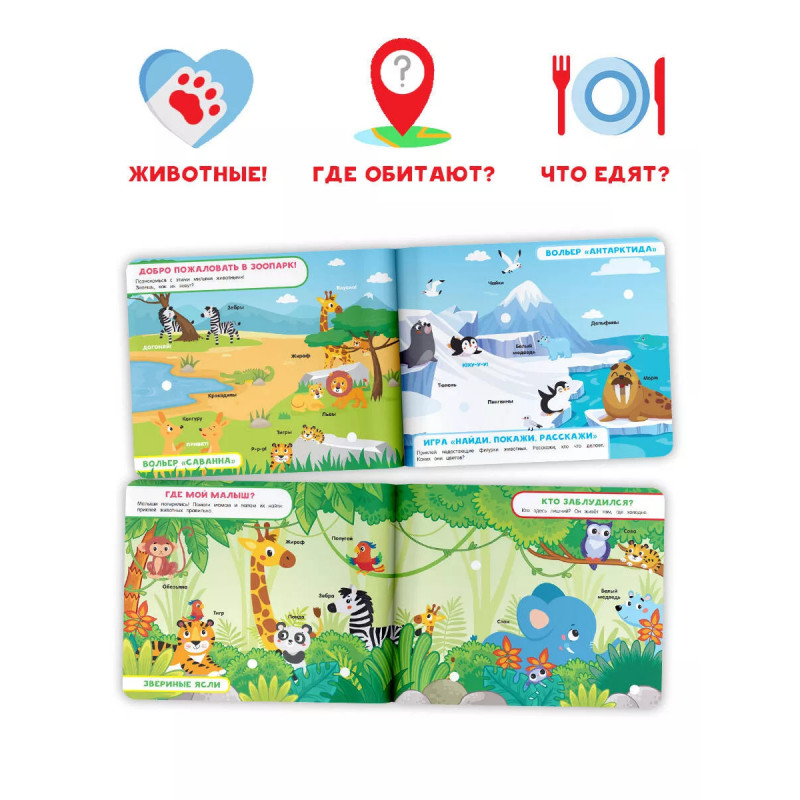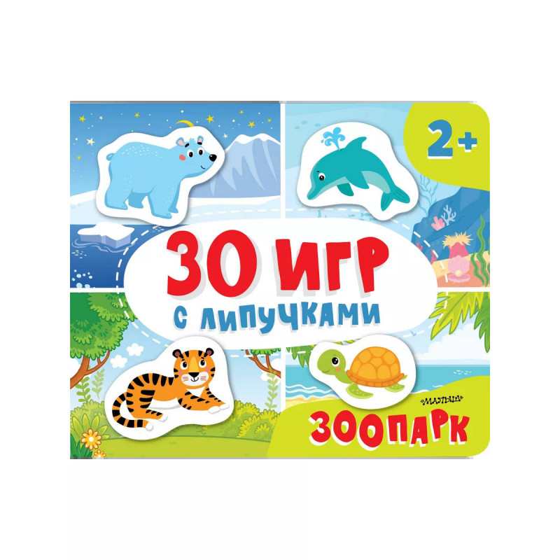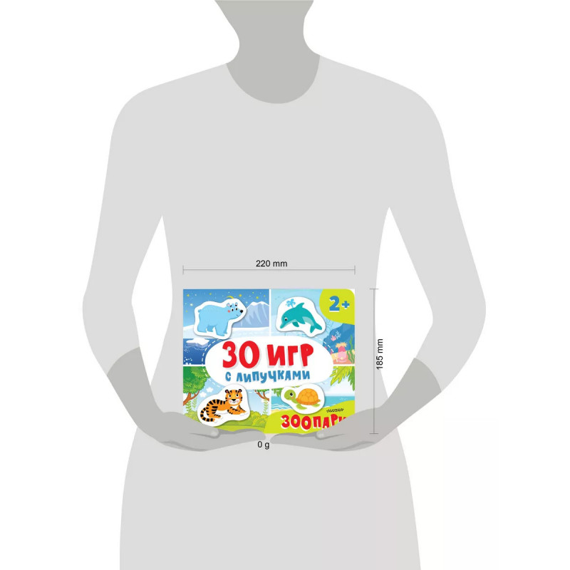 Добро пожаловать в зоопарк! Ваш ждут 30 увлекательных игр с липучками. Играя с этой книгой, ребёнок познакомится с милыми животными, узнает, где они обитают, что едят, как зовут их малышей. Кого здесь только нет! Тигры, львы, жирафы, зебры, крокодилы, кенгуру, пигвины, дельфины Внутри книги спрятан конверт с фигурками на липучках. Для каждой найдётся место на страницах, и даже не один раз! На каждом развороте ждет интересная игра: "Найди, покажи и расскажи", "Было и стало", "Считалочка", "Пятнышки-полоски" и другие. Растите и развивайтесь с удовольствием!