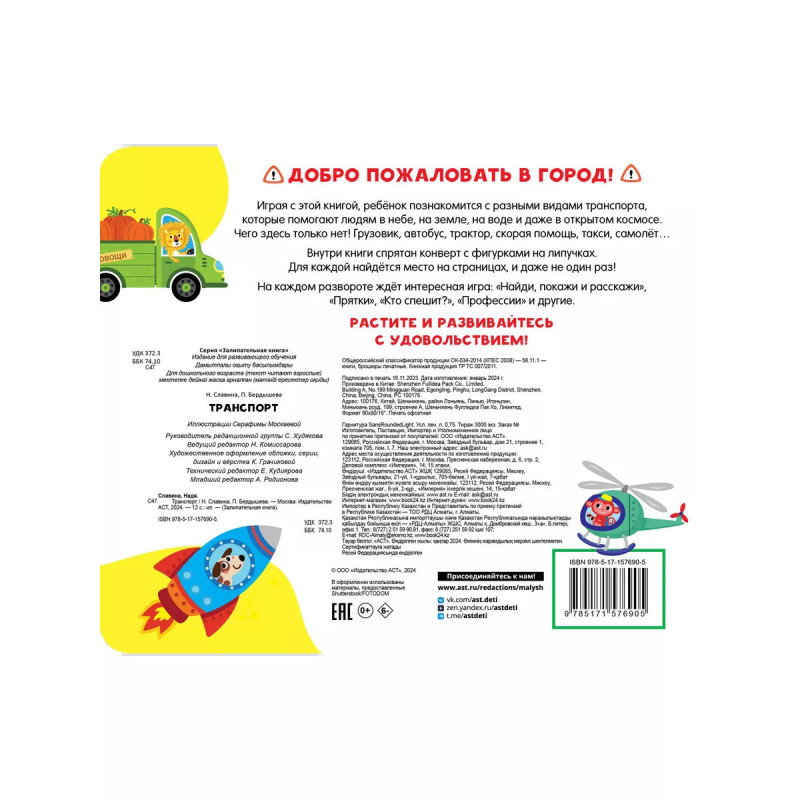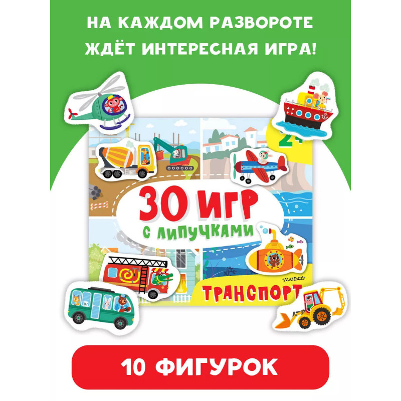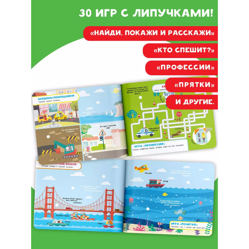 Добро пожаловать в город! Ваш ждут 30 увлекательных игр с липучками. Играя с этой книгой, ребёнок познакомится с разными видами транспорта, которые помогают людям в небе, на земле, на воде и даже в открытом космосе. Чего здесь только нет! Грузовик, автобус, трактор, скорая помощь, такси, самолёт Внутри книги спрятан конверт с фигурками на липучках. Для каждой найдётся место на страницах, и даже не один раз! На каждом развороте ждет интересная игра: "Найди, покажи и расскажи", "Прятки", "Кто спешит?", "Профессии" и другие. Растите и развивайтесь с удовольствием!
