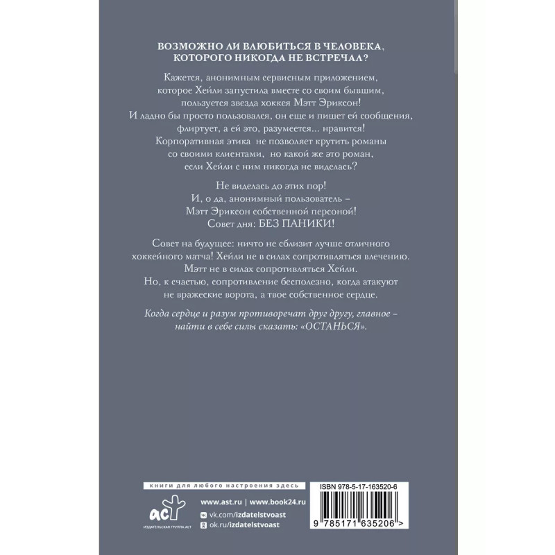 Кажется, анонимным сервисным приложением, которое Хейли запустила вместе со своим бывшим, пользуется звезда хоккея Мэтт Эриксон! И ладно бы просто пользовался, он еще и пишет ей сообщения, флиртует, а ей это, разумеется нравится! Корпоративная этика не позволяет крутить романы со своими клиентами, но какой же это роман, если Хейли с ним никогда не виделась? Не виделась до этих пор! И, о да, анонимный пользователь Мэтт Эриксон собственной персоной! Совет дня: БЕЗ ПАНИКИ! Совет на будущее: ничто не сблизит лучше отличного хоккейного матча! Хейли не в силах сопротивляться влечению. Мэтт не в силах сопротивляться Хейли. Но, к счастью, сопротивление бесполезно, когда атакуют не вражеские ворота, а твое собственное сердце.