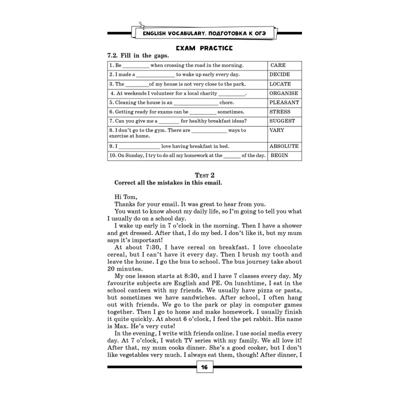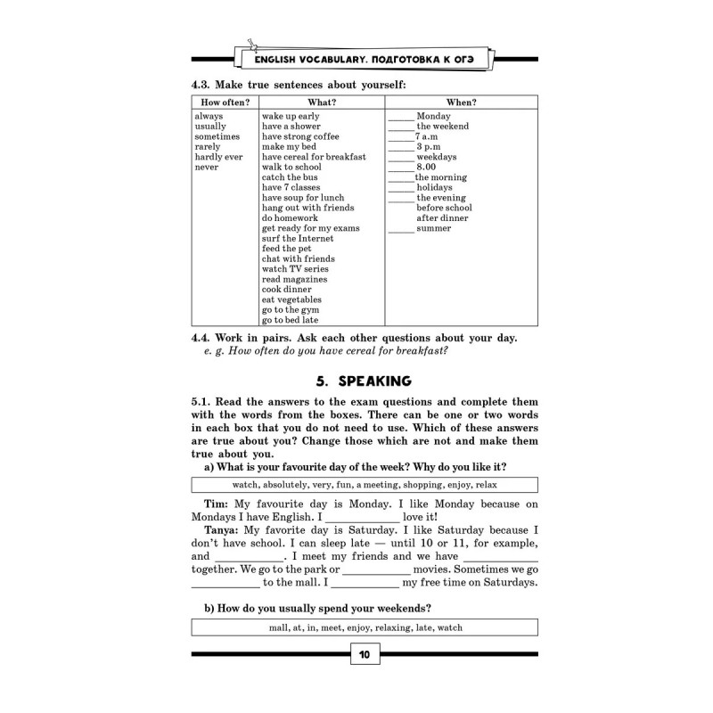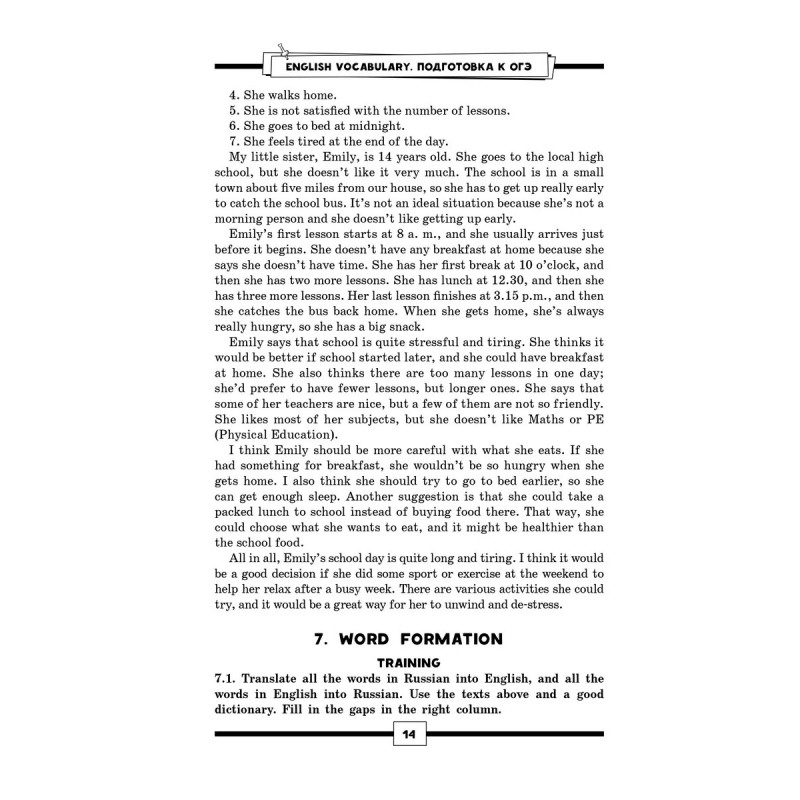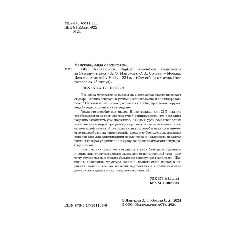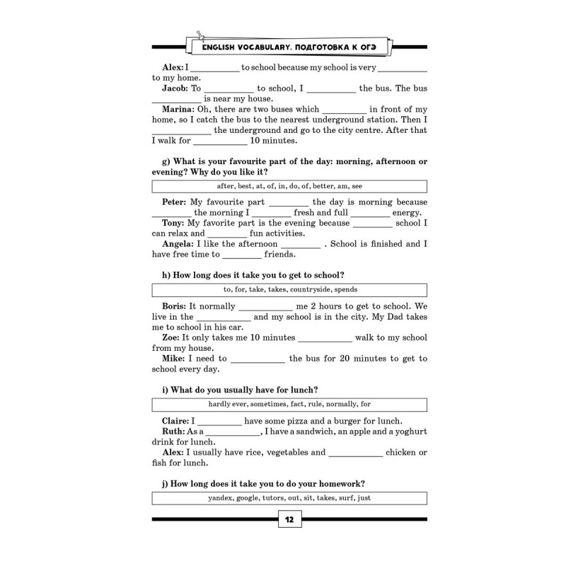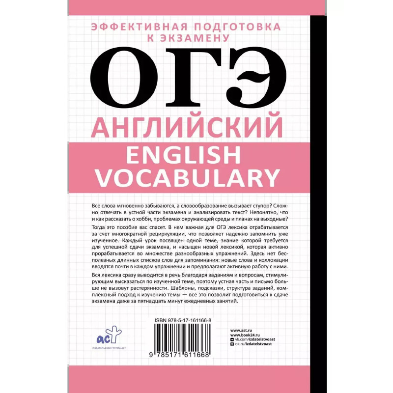 Все слова мгновенно забываются, а словообразование вызывает ступор? Сложно отвечать в устной части экзамена и анализировать текст? Непонятно, что и как рассказать о хобби, проблемах окружающей среды и планах на выходные?Тогда это пособие вас спасет. В нем важная для ОГЭ лексика отрабатывается за счет многократной рециркуляции, что позволяет надежно запомнить уже изученное. Каждый урок посвящен одной теме, знание которой требуется для успешной сдачи экзамена, и насыщен новой лексикой, которая активно прорабатывается в множестве разнообразных упражнений. Здесь нет бесполезных длинных списков слов для запоминания: новые слова и коллокации вводятся почти в каждом упражнении и сразу же предполагают активную работу с ними. Вся лексика сразу же выводится в речь благодаря заданиям и вопросам, стимулирующим высказаться по изученной теме, поэтому устная часть и письмо больше не вызовут растерянности.