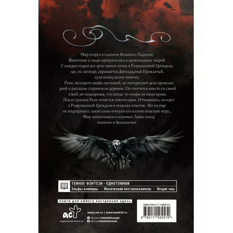 Глубокая и драматичная дарк-фэнтези история от талантливой писательницы Марии Токаревой. Мир сгинул в огне Великого Падения. Люди превратились в голодных чудовищ. С каждым годом пламя в Разрушенной Цитадели разгорается, суля конец всему живому. Говорят, Двенадцатый Проклятый прячется в ее чертогах. Молодому эльфу Рехи это неинтересно. Его задача охотиться и пить кровь. Он не знает, что так было не всегда. Но вот страшный ураган лишает Рехи его племени. Цепляясь за остатки надежды, он держит путь к Разрушенной Цитадели. Здесь он хочет найти ответы на вопросы, которых стало слишком много. Рехи еще не знает, какие могущественные силы втянули его в свою игру.