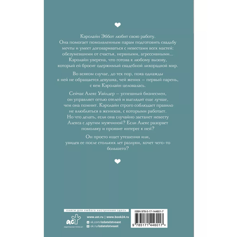 Кэролайн Эббот любит свою работу. Она помогает помолвленным парам подготовить свадьбу мечты и умеет договариваться с невестами всех мастей: обезумевшими от счастья, нервными, агрессивными Кэролайн уверена, что готова к любому вызову, который ей бросит одержимый свадебной лихорадкой мир. Во всяком случае, до тех пор, пока однажды к ней не обращается девушка, чей жених первый парень, с кем Кэролайн целовалась. Сейчас Алекс Уайлдер успешный бизнесмен, он управляет сетью отелей и выглядит еще лучше, чем она помнит. Кэролайн строго соблюдает правило не влюбляться в женихов, с которыми работает. Но что делать, если она случайно застанет невесту Алекса с другим мужчиной? Если Алекс разорвет помолвку и проявит интерес к ней? Он просто ищет утешения или, увидев ее после стольких лет разлуки, хочет чего-то большего?
