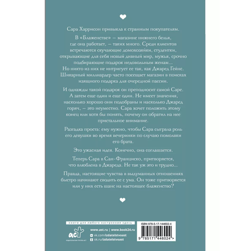 Сара Харрисон привыкла к странным покупателям. В "Блаженстве" магазине нижнего белья, где она работает, таких много. Но никто не интригует ее так, как Джаред Гейнс. Шикарный миллиардер часто посещает магазин в поисках изящного подарка для очередной пассии. И однажды такой подарок он преподносит самой Саре. А затем еще один и еще один. Не имеет значения, насколько хорошо они подобраны и насколько он горяч это неуместно. Сара хочет положить этому конец или хотя бы понять, почему он обратил на нее пристальное внимание. Разгадка проста: ему нужно, чтобы Сара сыграла роль его девушки во время вечеринки по случаю помолвки его брата. Это ужасная идея. Конечно, она соглашается. Теперь Сара в Сан-Франциско, притворяется, что влюблена в Джареда. Не так уж это и трудно Правда, настоящие чувства в выдуманных отношениях быстро начинают сводить ее с ума. Он тоже притворяется, или у них есть шанс на настоящее блаженство?