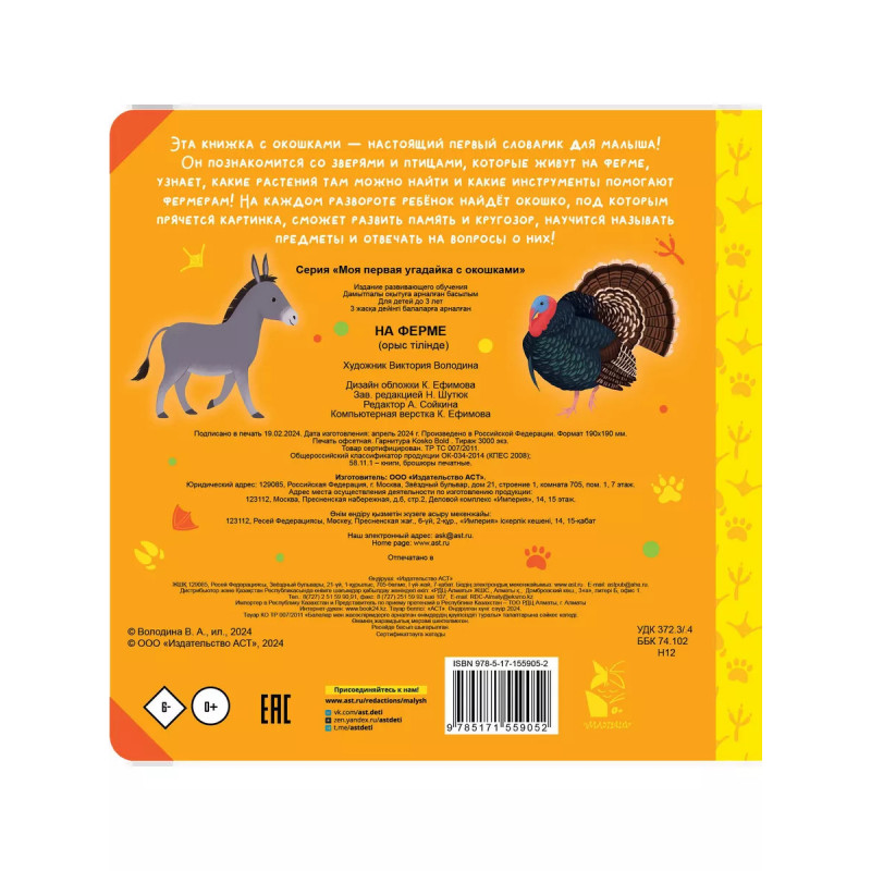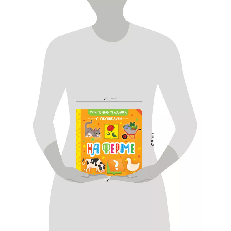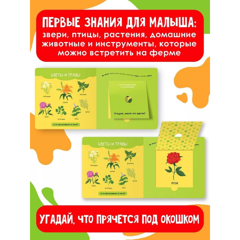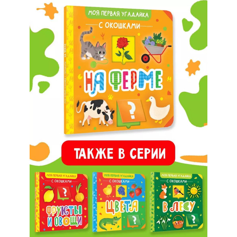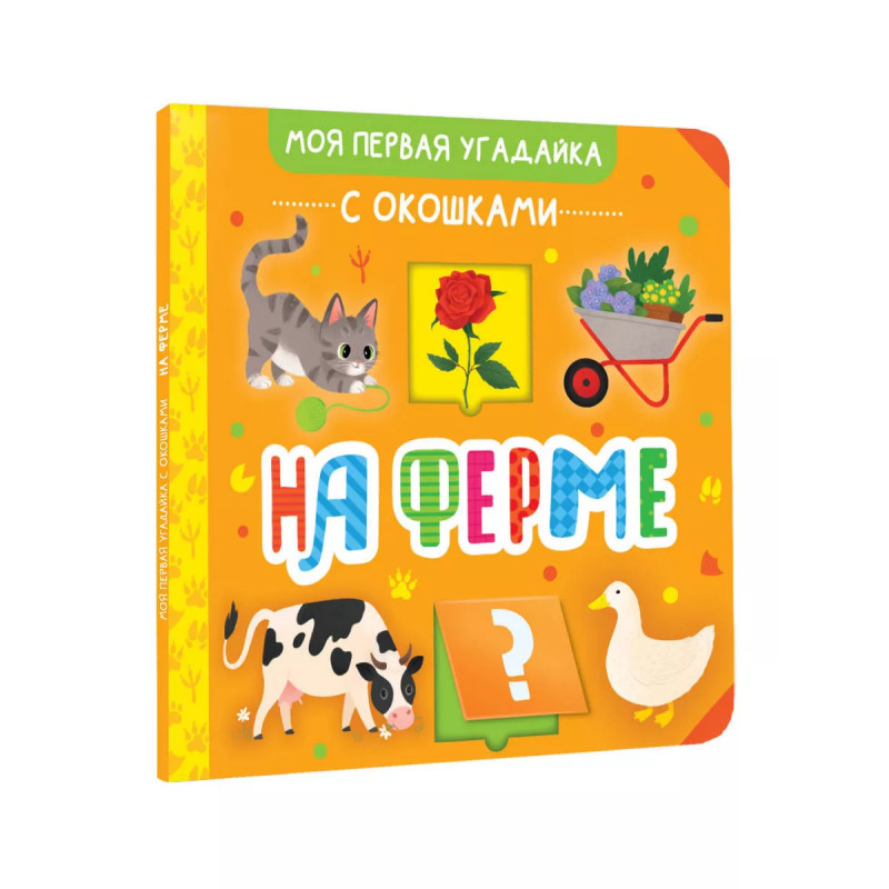 Эта книжка с окошками настоящий первый словарик для малыша! Он познакомится со зверями и птицами, которые живут на ферме, узнает, какие растения там можно найти и какие инструменты помогают фермерам! На каждом развороте ребёнок найдёт окошко, под которым прячется картинка, сможет развить память и кругозор, научится называть предметы и отвечать на вопросы о них! "Моя первая угадайка с окошками" - познавательная серия для самых маленьких читателей. Актуальные для малыша темы, плотные картонные странички, вопросы для развития речи и окошки превратят обучение в увлекательную игру!