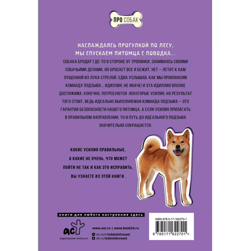 Наслаждаясь прогулкой по лесу, мы спускаем питомца с поводка... Собака бродит где-то в стороне от тропинки, занимаясь своими собачьими делами, но бросает все и бежит, нет летит к нам пущенной из лука стрелой, едва услышав, как мы произносим команду подзыва... Идиллия, не иначе! И эта идиллия вполне достижима. Конечно, потребуются некоторые усилия, но результат того стоит, ведь идеально выполняемая команда подзыва это гарантия безопасности нашего питомца. А если усилия прилагать в правильном направлении, то и путь до идеального подзыва значительно сокращается. Какие усилия правильные, а какие не очень, что может пойти не так и как это исправить, вы узнаете из этой книги.