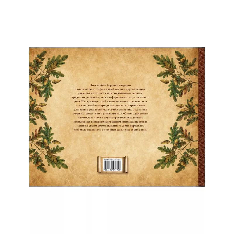 Этот альбом бережно сохранит памятные фотографии вашей семьи и другие ценные, уникальные, только ваши сокровища легенды, традиции, реликвии, песни и фирменные рецепты вашего рода. На страницах этой книги вы сможете запечатлеть важные семейные праздники, места, которые имеют для ваших родственников особое значение, рассказать о ваших совместных путешествиях, любимых домашних питомцах и многих других трогательных деталях. Родословная книга поможет вашим потомкам не терять связь со своим родом, помнить о своих корнях и с любовью знакомить с историей семьи уже своих детей.