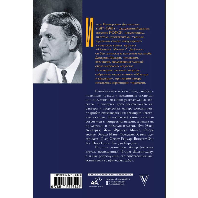 Игорь Викторович Долгополов (19171991) заслуженный деятель искусств РСФСР, искусствовед, писатель, просветитель, главный художник самого популярного в советское время журнала "Огонек". Ученик А. Дейнеки, он был личностью поистине масштаба Джорджо Вазари, человеком, всю жизнь создававшим единый образ мирового искусства. Его очерки о великих творцах, собранные позже в книги "Мастера и шедевры", при жизни автора печатались огромными тиражами. Написанные в легком стиле, с необыкновенным чутьем и подлинным талантом, они представляли собой увлекательные рассказы, в которых ярко раскрывались характеры и творческая манера художников, подробно описывались их всемирно известные полотна. В настоящей книге читатель встретится с импрессионистами, а также их предтечами и последователями. Это Эжен Делакруа, Жан Франсуа Милле, Оноре Домье, Эдуард Мане, Фредерик Базиль, Эдгар Дега, Пьер Огюст Ренуар, Винсент Ван Гог, Поль Гоген, Антуан Бурдель.