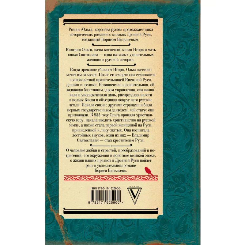 Роман "Ольга, королева русов" продолжает цикл исторических романов о князьях Древней Руси, созданный Борисом Васильевым. Княгиня Ольга, жена киевского князя Игоря и мать князя Святослава одна из самых удивительных женщин в русской истории. Когда древляне убивают Игоря, Ольга жестоко мстит им за мужа. После его смерти она становится полновластной правительницей Киевской Руси. Деяния ее велики. Независимая и решительная, обладавшая блестящим даром управленца, она назначала и упорядочивала дань, распределяя налоги в пользу Киева и объединяя вокруг него русские земли. Искала связи с другими странами и была первым государственным деятелем, чей статус они признавали. В 955 году Ольга приняла христианскую веру, начала вводить христианство на русской земле, а позже стала первой женщиной на Руси, причисленной к лику святых. Она воспитала достойных внуков, один из них Владимир Святославич стал крестителем Руси.