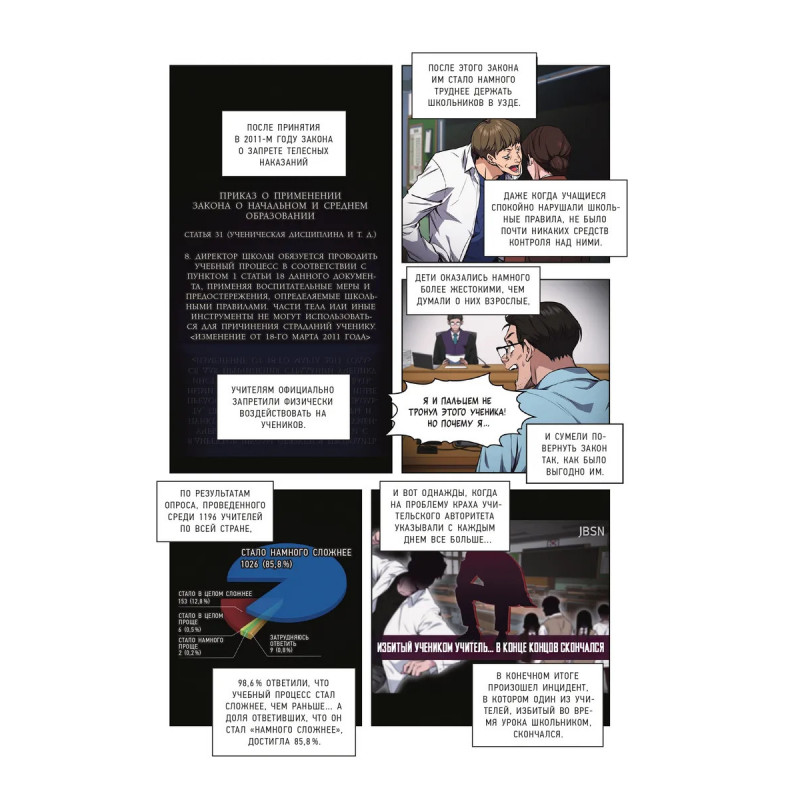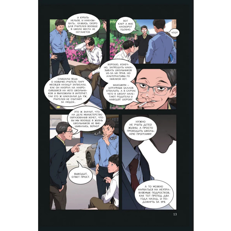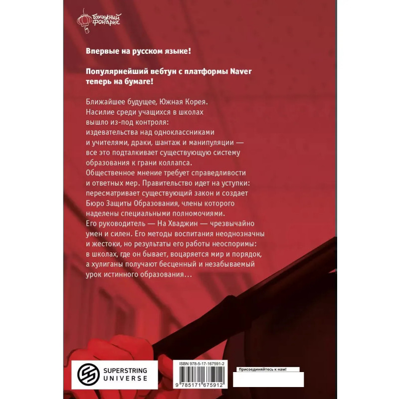 Впервые на русском языке популярнейший вебтун с платформы Naver! В Корее назрела серьезная проблема: насилие среди школьников выходит из-под контроля и от него страдают как учителя, так и другие учащиеся. Министерство образования, чувствуя кризис в существующей системе, создает специальное Бюро Защиты Образования, члены которого наделены специальными полномочиями: иными словами они могут использовать любые средства для того, чтобы вернуть порядок в школах. Капитан На Хваджин становится во главе Бюро. Его методы многим кажутся жестокими, но на самом деле они крайне эффективны, ведь с их помощью даже в самых неблагополучных школах устанавливается мир, а самые худшие хулиганы получают бесценный урок и осознают, что такое истинное образование. Для широкого круга читателей.