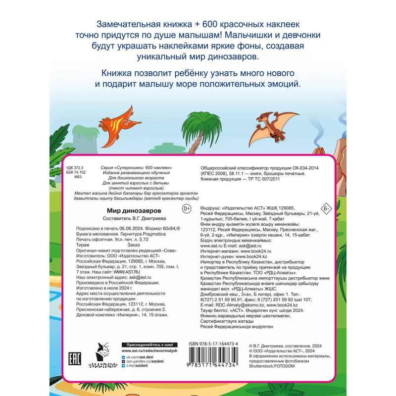 Мир динозавров это креативная и забавная книга. 600 качественных наклеек с изображением динозавров. Ребёнок сам решает, как расположить наклейки на красочных фонах. Это отличная возможность для развития воображения, мелкой моторики и логики. Игра с наклейками не только развлекает, но и обучают. Малыш узнает о разных динозаврах, которые живут в воде, на суше и летают в небе. Книга способствует развитию любознательности и исследовательских навыков у детей. Прекрасно подходит для совместного времяпровождения в семье или для самостоятельных занятий.
