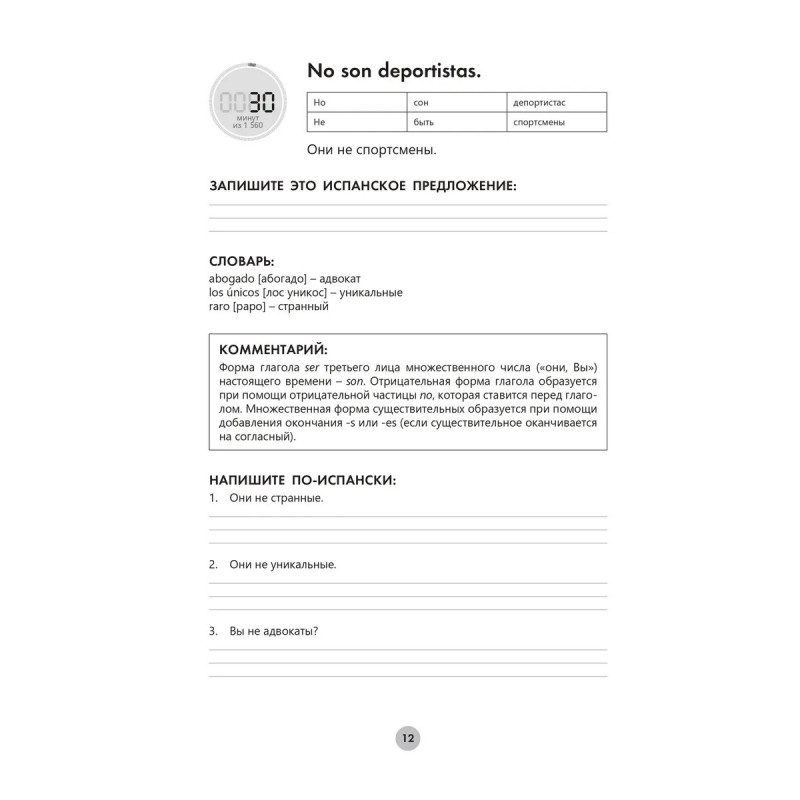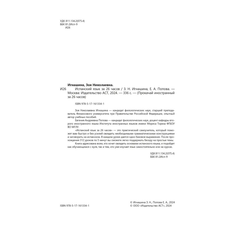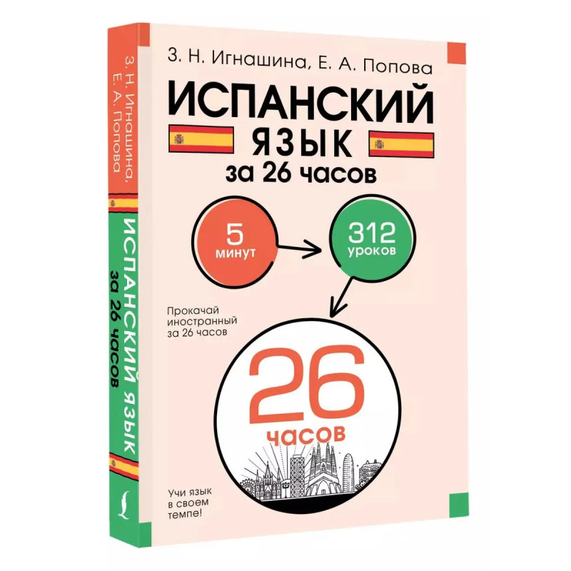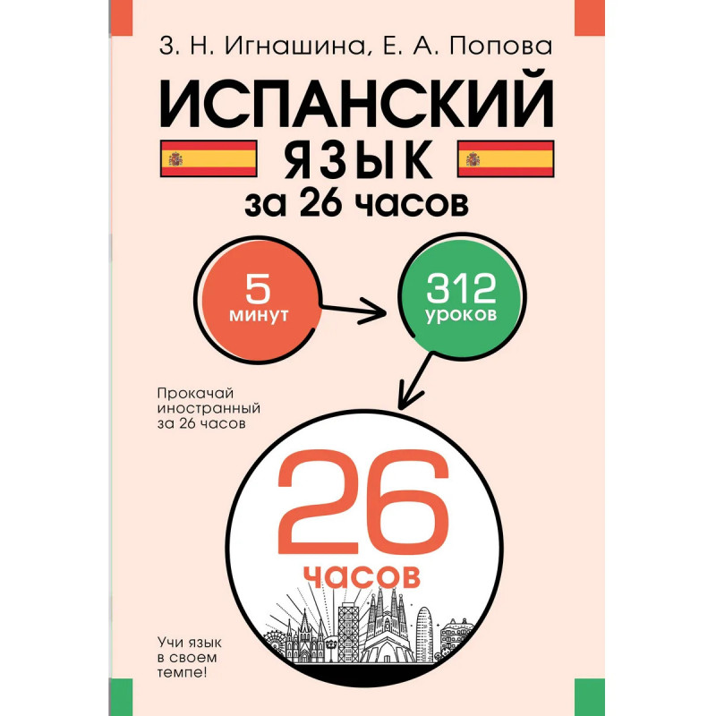 Зоя Николаевна Игнашина кандидат филологических наук, старший преподаватель Финансового университета при Правительстве Российской Федерации, опытный автор учебных пособий. Евгения Андреевна Попова кандидат филологических наук, доцент кафедры второго иностранного языка Института иностранных языков имени Мориса Тореза ФГБОУ ВО МГЛУ. "Испанский язык за 26 часов" это практический самоучитель, который поможет вам быстро и без усилий овладеть необходимыми грамматическими конструкциями и заговорить на испанском. В каждом уроке дается одно базовое выражение. После прохождения 312 уроков по 5 минут вы сможете легко поддержать беседу на простые темы. Книга адресована всем, кто хочет овладеть основами испанского языка, и подойдет как обучающимся с нуля, так и тем, кто уже изучает язык самостоятельно или на курсах.