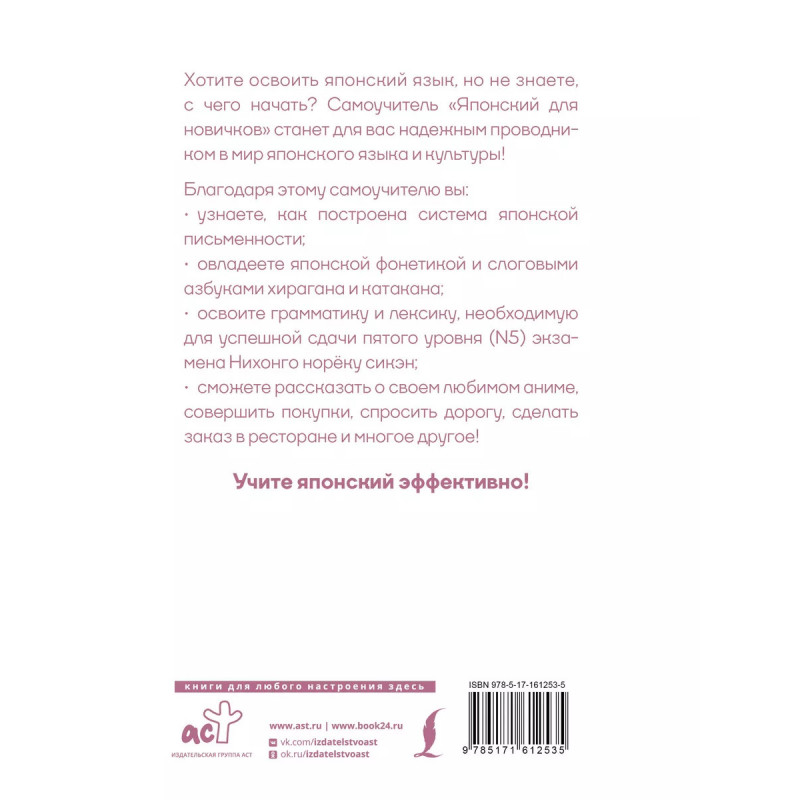 Японский для новичков. Александра Сыщикова - дипломированный специалист по японскому языку и литературе, автор справочных и учебных пособий. Данный самоучитель охватывает весь объем грамматического, лексического и иероглифического материала, необходимого для изучения языка на начальном уровне. Материал изложен максимально понятно и доступно и прекрасно запоминается благодаря большому количеству наглядных схем, таблиц и примеров с общеупотребительной лексикой. Для успешного закрепления пройденной темы в каждом уроке вы найдете упражнения, ключи к которым находятся в конце книги. Завершают издание краткий словарь и мнемонические карточки для запоминания иероглифов и слоговых азбук хирагана и катакана. Пособие предназначено для широкого круга лиц, изучающих японский язык.